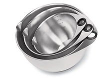 This set of 2-, 4- and 6-quart brushed stainless steel mixing bowls with lids have a silicone bottom and a padded thumb hole to steady the bowl. Internal measure marks give you a quick reference for capacity. Pour spouts help portion pancakes and more. Dishwasher-, refrigerator- and freezer-safe. Set of 2, 4 and 6 qts Standard and metric measure marks inside the bowl. Spouts help you pour liquids,